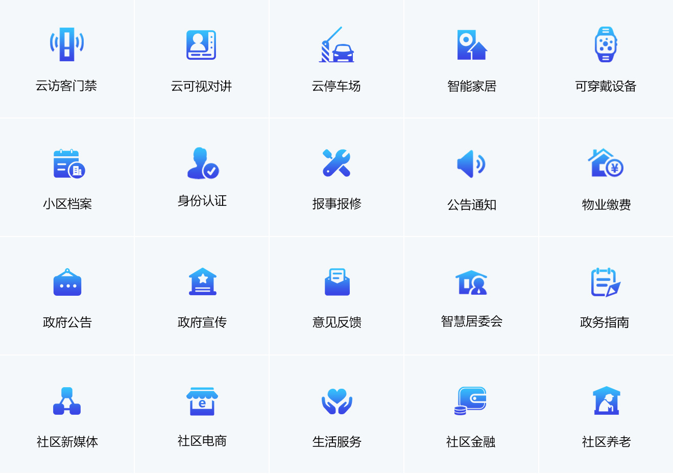 運用AI、物聯(lián)網(wǎng)、SaaS、ARVR等全新技術(shù)為未 來(lái)智慧社區建設提供智能化支撐。 其主要含車(chē)輛管理、智能廣播和發(fā)布宣傳、出入口人臉識別、 智能安防、危險識別與報警、智能梯控、 小區內智能步道、社區智慧體側和保健小屋、 一鍵求助報警、智能家居、小區物業(yè)綜合服務(wù)平臺、 智能大數據可視化系統等功能模塊。系統包括地市級、 區縣級管理平臺,兼顧建設標準及地方使用實(shí)際。 實(shí)現“多途徑采集、多鏈路傳輸、多層級儲存、 多中心處理、多平臺共享”。