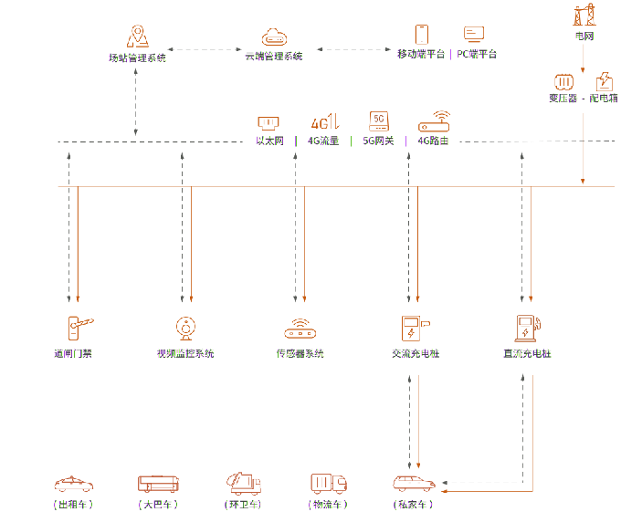 通過(guò)搭建新能源汽車(chē)直流/交流充電系統, 負載監測、超負荷報警、溫度傳感器、高溫報警、 煙感裝置等配套設施,通過(guò)物聯(lián)網(wǎng)卡、 4G/5G智能網(wǎng)關(guān)等進(jìn)行設備通訊及云端數據同步, 配以電腦端/手機端可視化電站管理平臺, 打造[充電樁終端-電站-云端-管控]一站式充電解決方案。